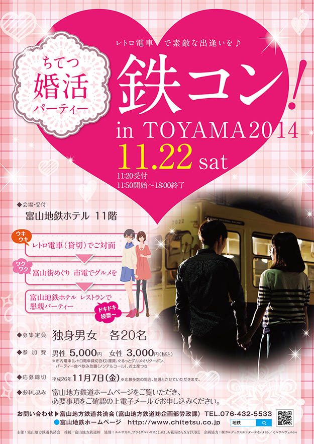婚活イベント「鉄コン! in TOYAMA 2014」 婚活イベントの企画協力をさせていただきました。10月のTJとやまに掲載されています。 お客様の要望を伺い、イベントを企画提案いたしました。 詳しくは→http://www.chitetsu.co.jp/?p=16272
